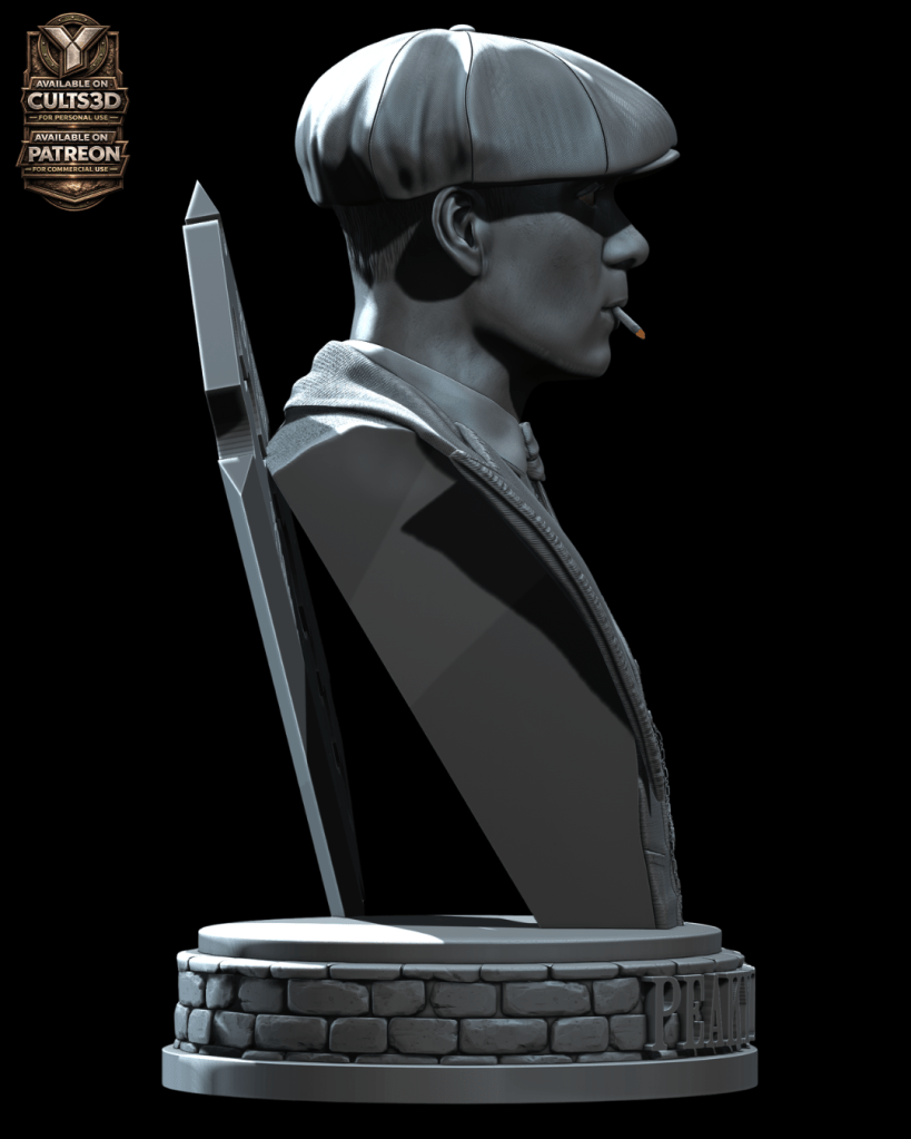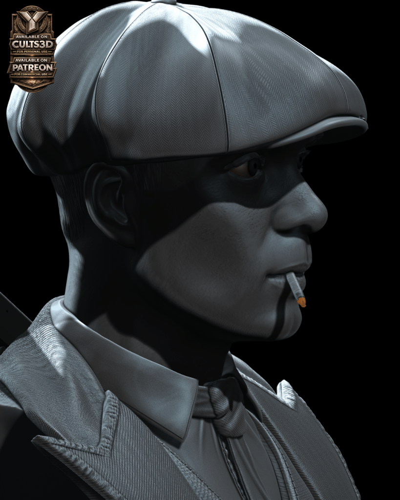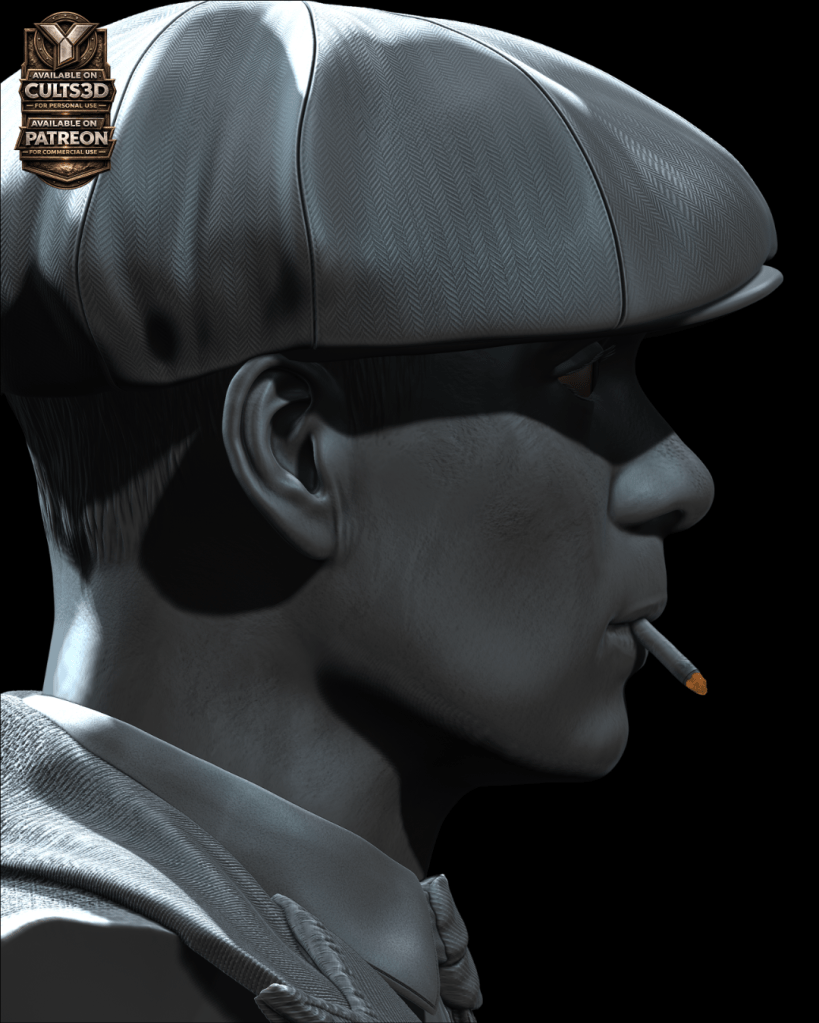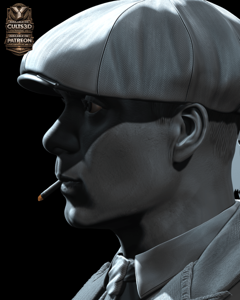 Inspirado por esa presencia imponente nace este busto de Thomas Shelby en escala 1:6, una escultura digital diseñada para impresión 3D que captura la esencia del líder de los Peaky Blinders: su mirada calculadora, su icónica gorra y el carácter frío que define al personaje.