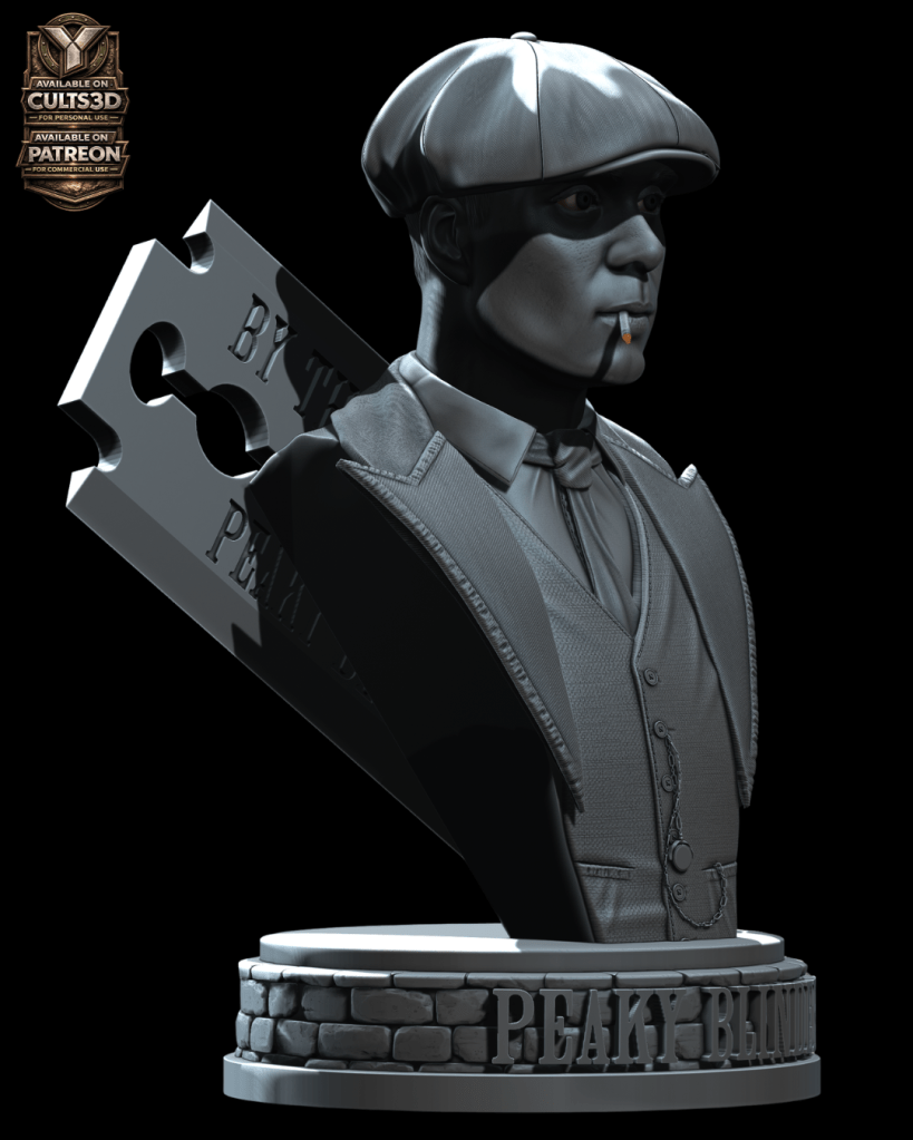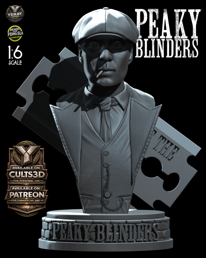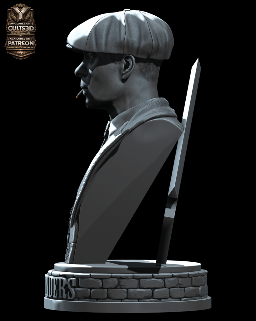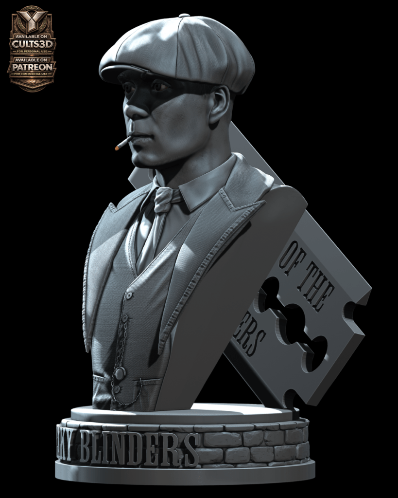 Inspirado por esa presencia imponente nace este busto de Thomas Shelby en escala 1:6, una escultura digital diseñada para impresión 3D que captura la esencia del líder de los Peaky Blinders: su mirada calculadora, su icónica gorra y el carácter frío que define al personaje.