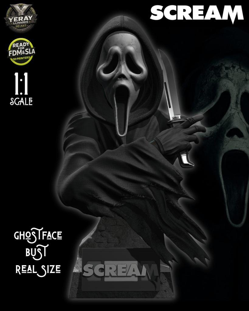 Presento esta escultura busto de Ghostface, inspirada en el icónico asesino de la saga Scream. Una pieza diseñada para capturar la presencia inquietante del personaje, combinando una composición dinámica, una pose amenazante y un nivel de detalle pensado para impresión 3D de alta calidad.